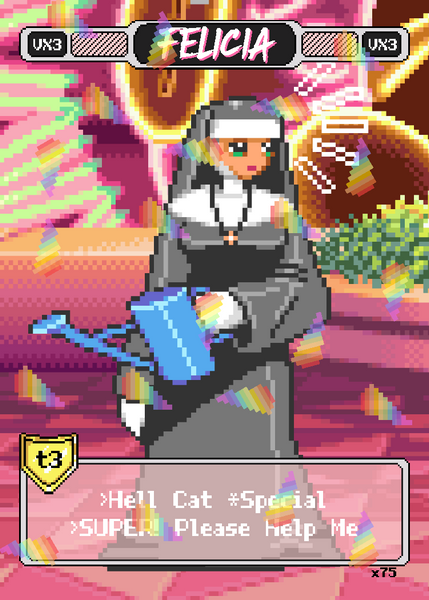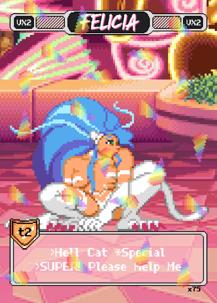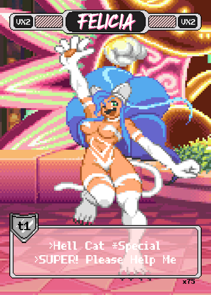 Felicia is a Catwoman who was taken in and raised by a Sister named Rose who gave her the name Felicia from the word Felicity. Despite her identity as a Darkstalker being exposed, she was not turned away by her as Felicia had feared. When Rose passed away, Felicia left her town hoping to be a musical star. Here she is removing her Nun outfit. Animated by AdamEX