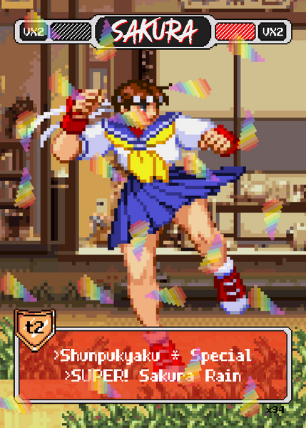 Sakura Kasugano (春日野 さくら Kasugano Sakura?) is a video game character from the Street Fighter series, first appearing in Street Fighter Alpha 2. She is a Japanese girl with an intense fixation on Ryu, having copied and learned many of his techniques, and chasing him around the world to prove herself to him. Here she is shooting off a fireball.