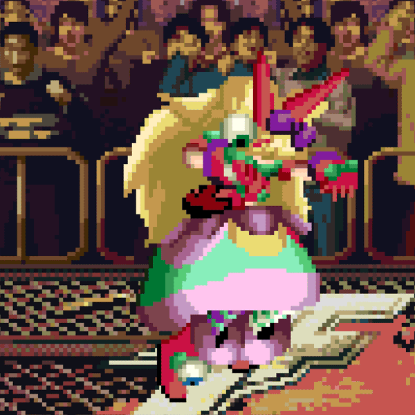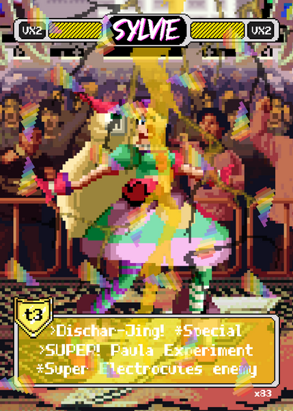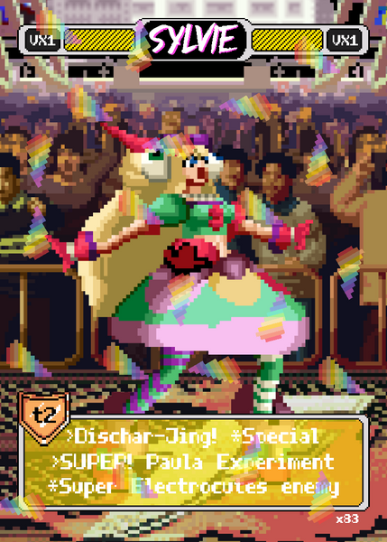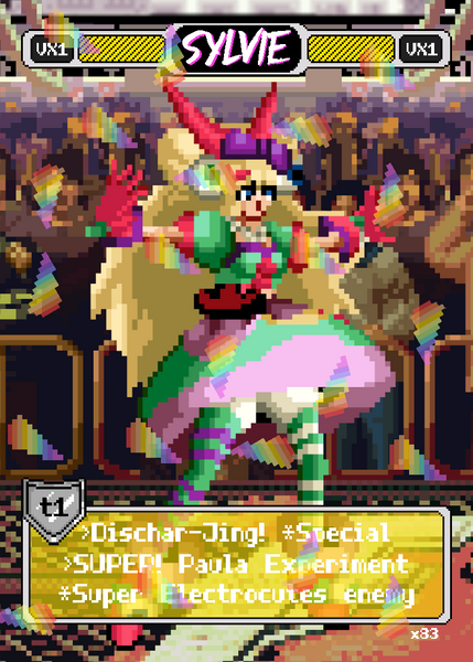 Sylvie Paula Paula (シルヴィ・ポーラ・ポーラ) is a character from The King of Fighters series. She was introduced in The King of Fighters XIV as a rejected NESTS operative with a very zany persona. Her official nickname is "The Late Blooming Blitz Eyeie". Here she is channeling lightning.